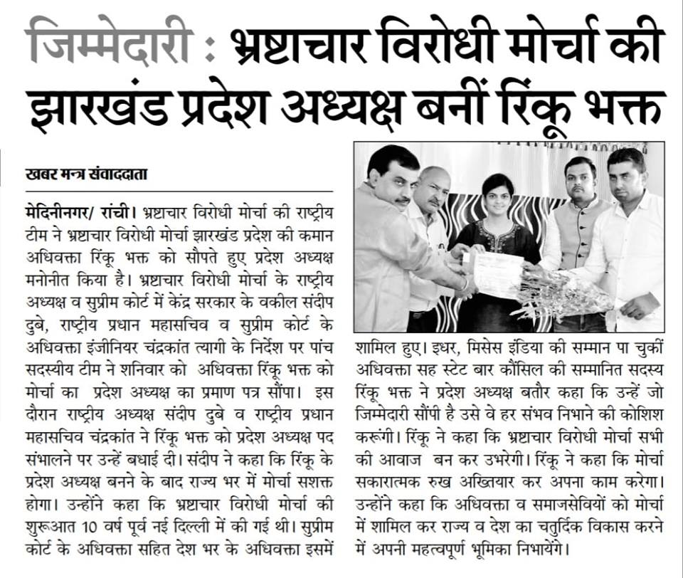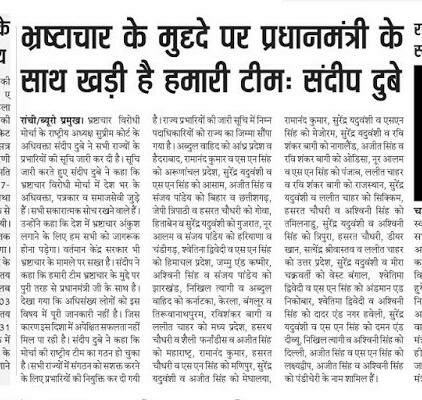 भ्रष्टाचार विरोधी मोर्चा गठित कर युवाओं, बुध्दिजीवियों, समाजसेवियों और प्रबुध्द नागरिकों के लिए एक प्लेटफार्म तैयार कर दिया है।